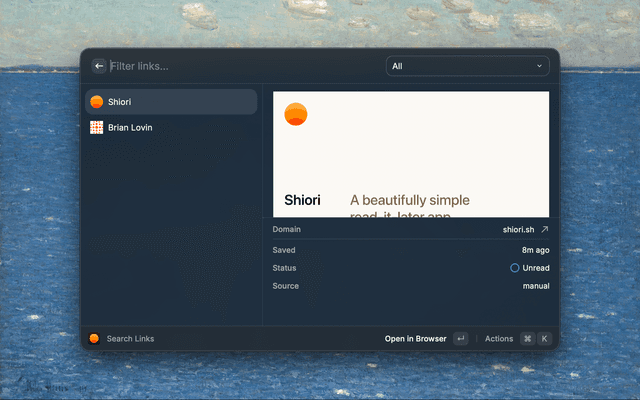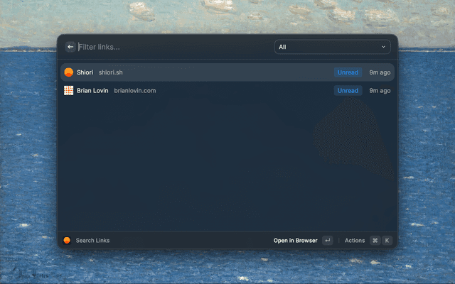 https:// if missing.⌘N inside Search Links to save whatever URL is on your clipboard.⌘R. Changes are optimistic so the UI updates instantly.shk_). See the API docs for details.| Command | Description | Mode |
