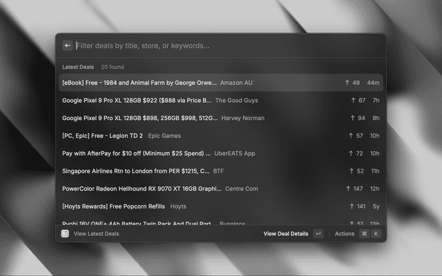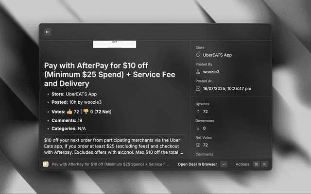 Your lightning-fast portal to the latest and hottest deals from OzBargain. Browse new bargains, check their popularity score, and jump straight to the deal or discussion without leaving your keyboard. Essential for savvy shoppers in Australia!