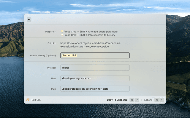 A productivity-focused Raycast extension for parsing, editing, and managing URLs with advanced features like query parameter editing, QR code generation, clipboard integration, and custom aliases for easy recall.
