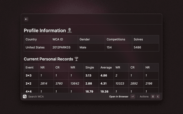 Shows you the WCA profile for a name or WCA ID