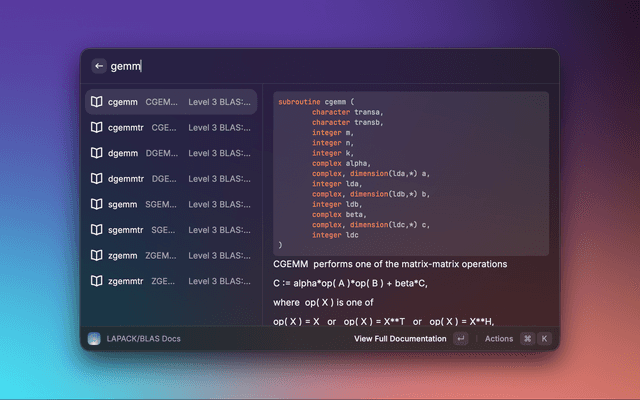 Quickly search through official LAPACK/BLAS documentation directly from Raycast.