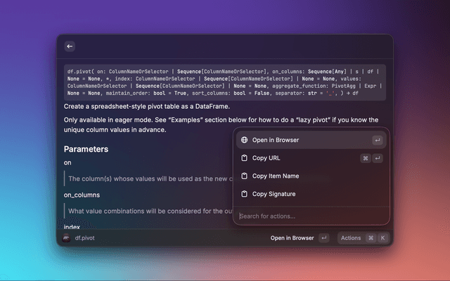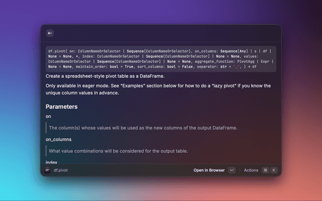 A Raycast extension that lets you search the Polars API reference and preview detailed documentation without leaving Raycast. Results include signatures, descriptions, parameters, and return values, with quick actions to open the official docs in your browser.