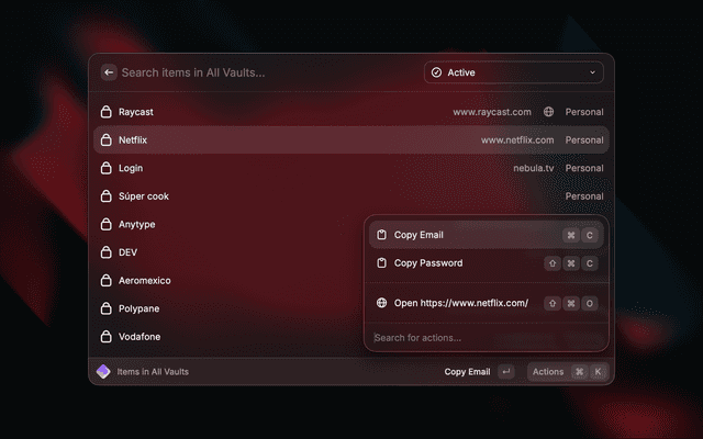 - Supports different item types: you can copy fields from various item types (e.g., login, password, credit card, identity) directly from Raycast