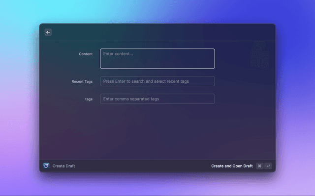 Create drafts in a Raycast form with tags (either with opening it afterwards or in the background).