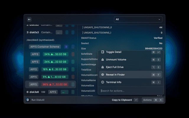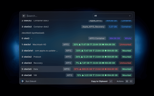The usage is fairly intuitive. Each disk has multiple actions in Raycast which are self-explanatory and change based on the type and status of the disk/volume. Just try it!