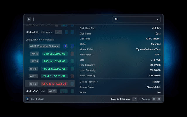 The usage is fairly intuitive. Each disk has multiple actions in Raycast which are self-explanatory and change based on the type and status of the disk/volume. Just try it!