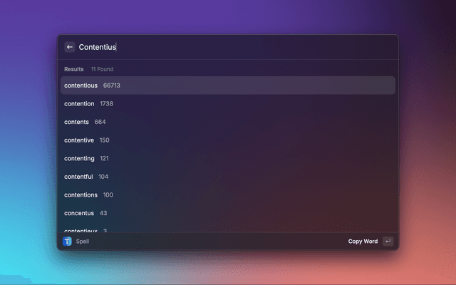 Struggling to spell a word? With this Raycast extension, even with typos, you can type the word and receive a list of matching suggestions using the OneLook API.