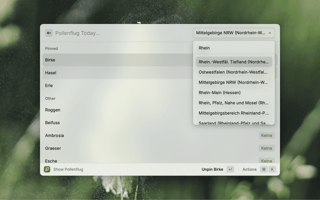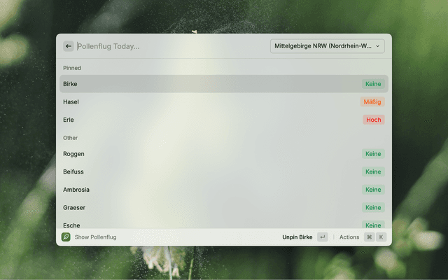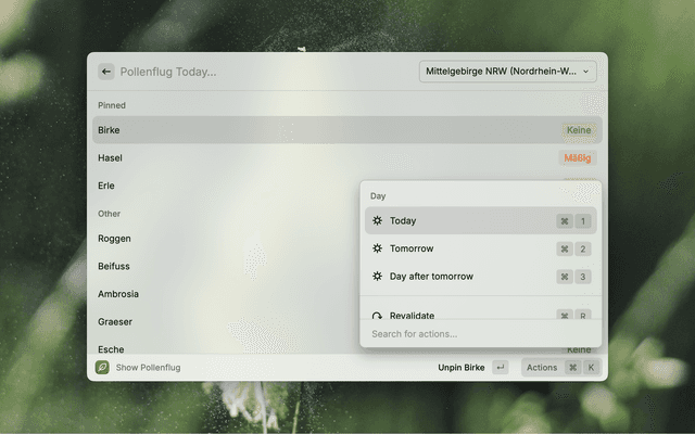 Pin allergens relevant for you, and choose from the regions provided by DWD. Using ⌘+1, ⌘+2 and ⌘+3 you can cycle through today, tomorrow and the day after.