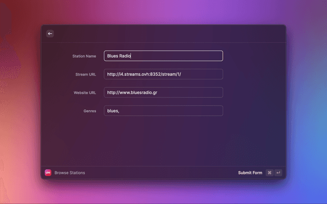 To add new stations, you can either use the built-in Search Stations command to search a dataset of known radio stations, or you can manually input a station using the New Station command.