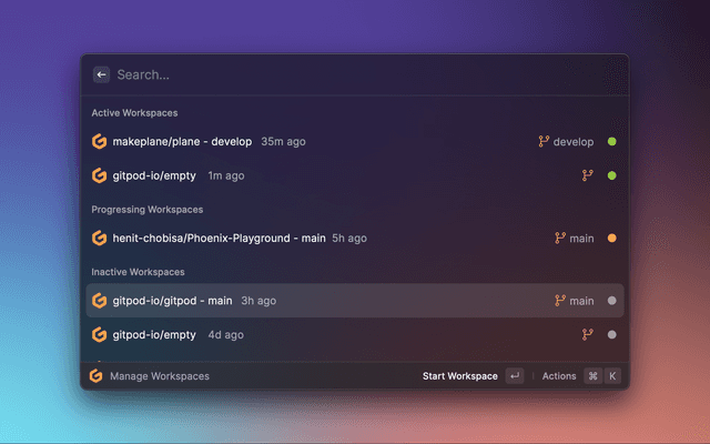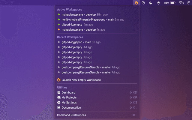 Menubar Workspaces is the command that gets the extension so near to achieving it's goal of making Gitpod Faster than local, with it's function to start workspaces and opening it into your favourite IDE in just a click!