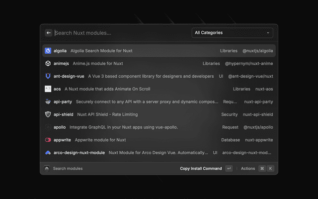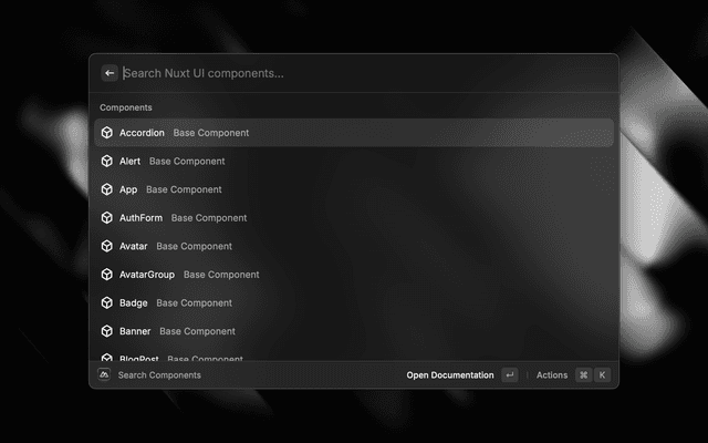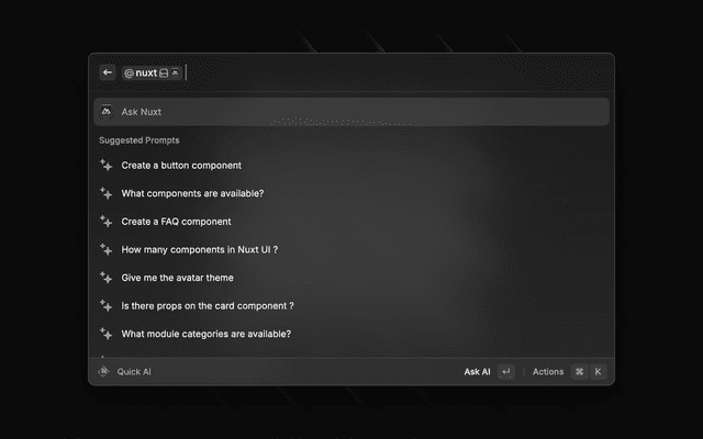 - Direct Shortcuts: Access Nuxt docs, components, and modules search
