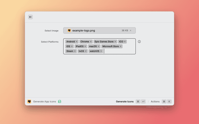 - Generate icons for multiple platforms: ICO, iOS, iPadOS, macOS, Android, watchOS, tvOS, Chrome, Microsoft Store, Steam, and Epic Games Store