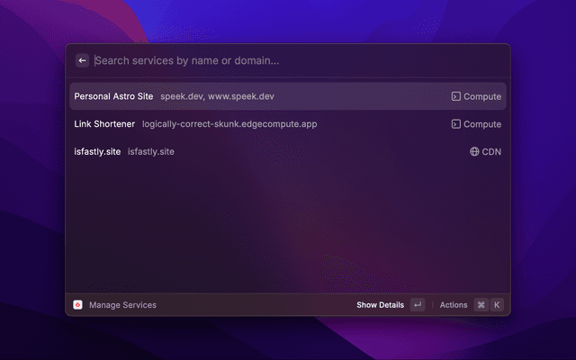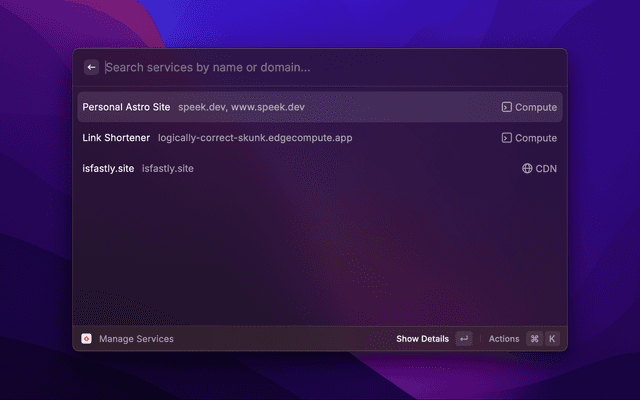 Manage services serves as a list of all your delivery and compute services, allowing you to search name or domain. From the list view, you can hit ⏎ to see service details, ⌘+⏎ opens the service in the Fastly Control Panel, ⌘+⇪+P runs a purge all on that service, and ⌘+⇪+R opens the real-time stats dashboard, while ⌘+⇪+L opens the logs.