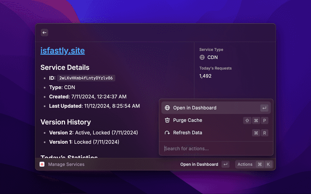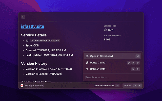 When selecting a specific service, you'll see service details such as today's requests, bandwidth, cache hit ratio, errors, version history, etc. You'll also be able to use all the same shortcuts to open in the Fastly Control Panel, run a purge all, etc. from this view.