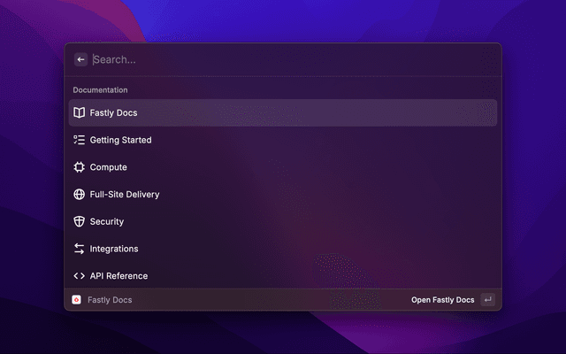 In the Fastly Docs command, you'll see a quick list of the most popular and helpful resources for working with Fastly. A getting started guide, API and CLI references, as well as some product guides are right at your fingertips.