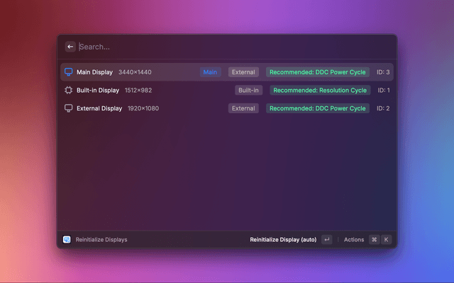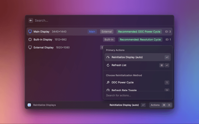 A Raycast extension to force re-detection and reinitialization of connected displays on macOS using multiple methods.