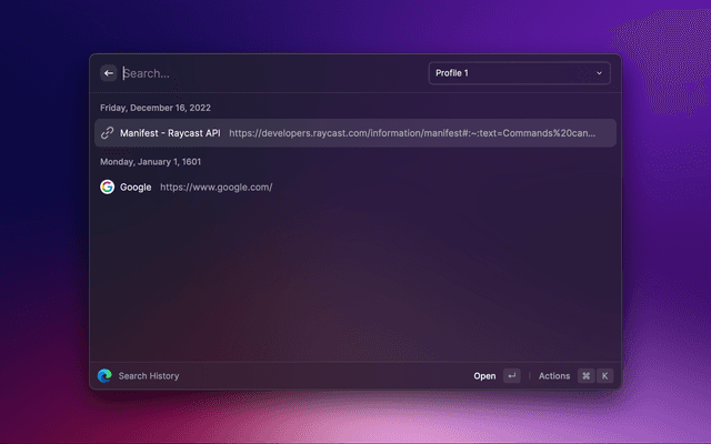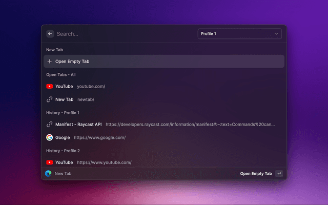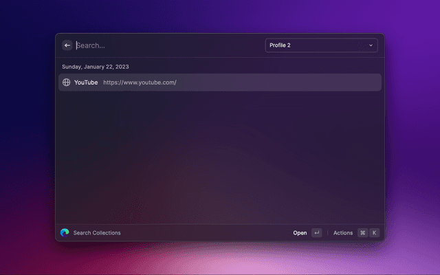 Open profile support is limited to opening tab in new profile window. You can customize default tab opening behaviour in Preferences.
