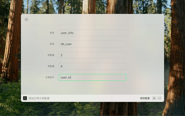 Configure basic parameters for database sharding, supporting table names, database names, shard counts, and other settings.