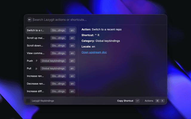 • Search Lazygit actions (e.g., “cherry pick”) or shortcuts (e.g., cmd+c).