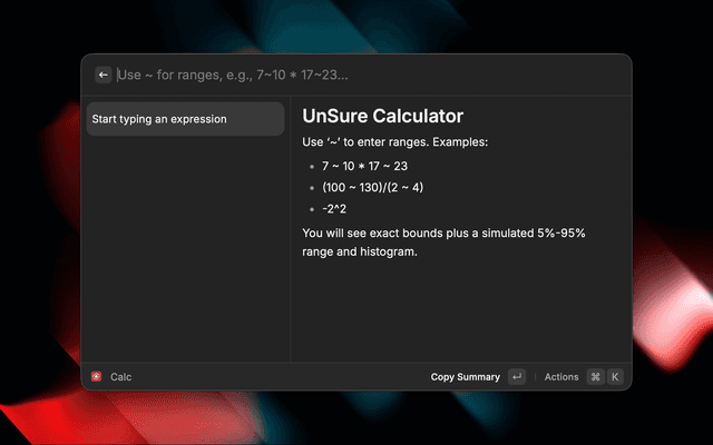 Lightweight probabilistic calculator that lets you type ranges (with ~) and arithmetic to see exact bounds plus simulated outcomes and a text histogram.