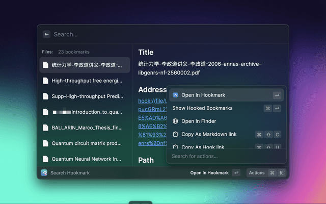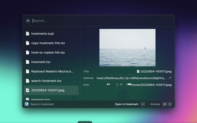 This Hookmark extension aims to provide a bookmarks search UI in Raycast. It is similar to the Free Alfred Workflows for Hookmark – Hookmark workflow in Alfred. You can retrieve all your Hook bookmarks in Raycast.