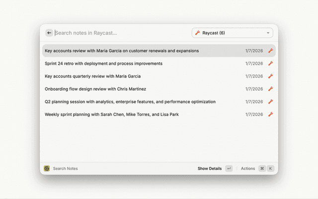 - Search Notes - View your notes in a list, see their details (including transcript), copy their links, or copy their contents as HTML or Markdown