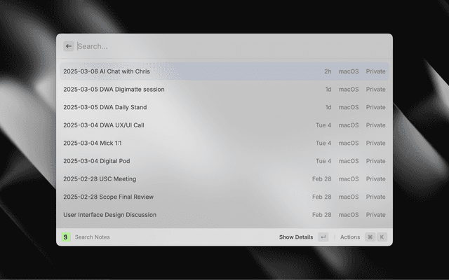 • Search Notes - View your notes in a list, see their details (including transcript), copy their links, or copy their contents as HTML or Markdown