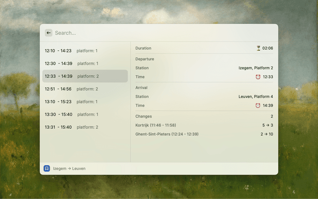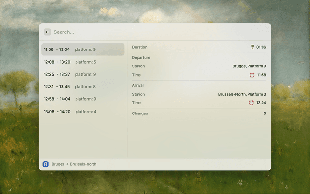nmbs-planner is a small Raycast extension that fetches train connection information (departure, arrival, duration, platform, and intermediate stops) and presents it in a compact list/detail view.