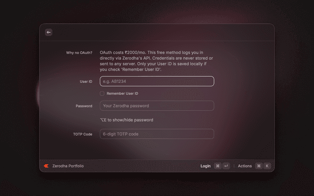 - Your credentials go directly to Zerodha's servers — never to any third-party