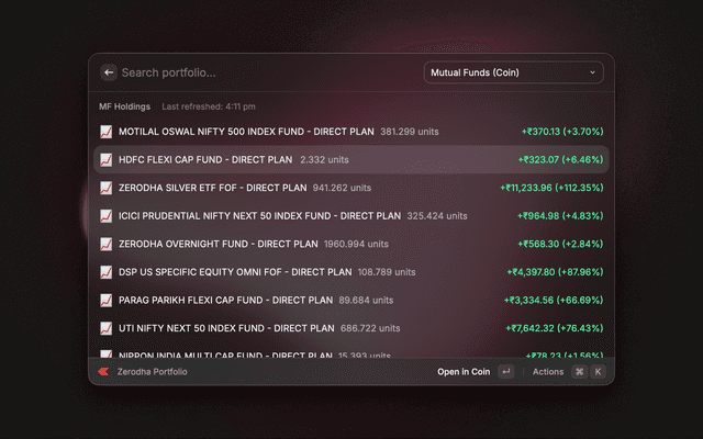A Raycast extension to view your Zerodha portfolio — stocks from Kite and mutual funds from Coin — right from your launcher.
