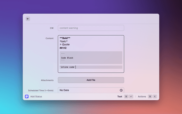 Toggle the "Markdown" checkbox to render markdown in the text file. Markdown shortcuts are also supported (e.g., pressing ⌘ + B will add **bold** around the selected text, ⌘ + I will make the selected text italic, etc.).