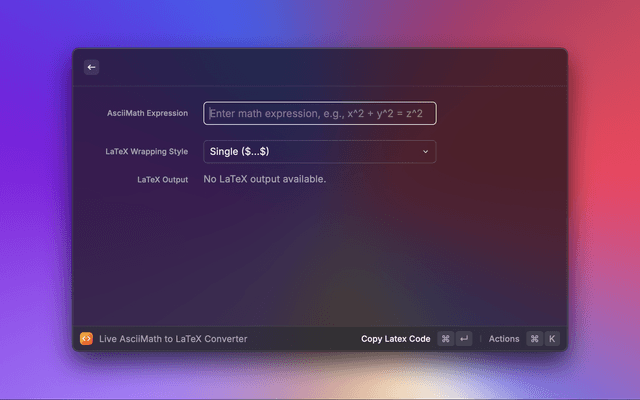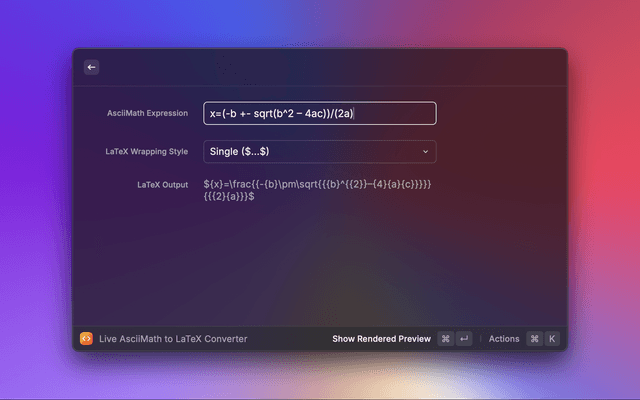 Convert AsciiMath expressions to LaTeX with a live preview in Raycast.