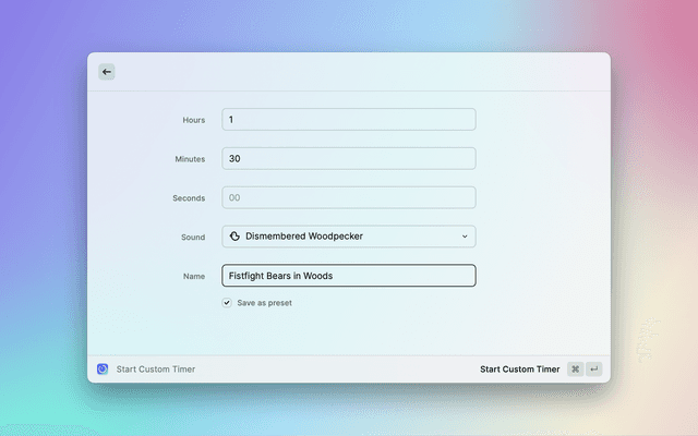 raycast/extensions repo, please ping me (@ThatNerdSquared) so that I don't miss your request!@ThatNerd(Squared)) if I have not responded to you in a timely manner.src/hooks/useTimers.ts contains the custom React hook that I use for state management across various commands, and timerUtils.ts contains backend functions I use to create the actual timer files.customTimers.json file as an array of CustomTimers, and running timers are stored as text files where the filename is [date and time started, with illegal characters replaced with __]---[length of timer in seconds] and the file content is a single line with the name of the timer.Sound effects procured royalty-free from Mixkit.