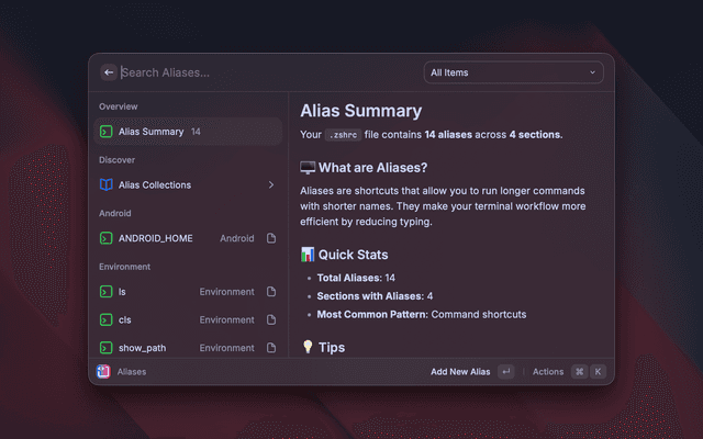 A powerful Raycast extension for managing your ~/.zshrc configuration file