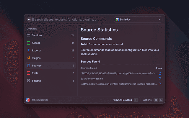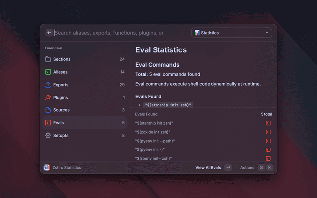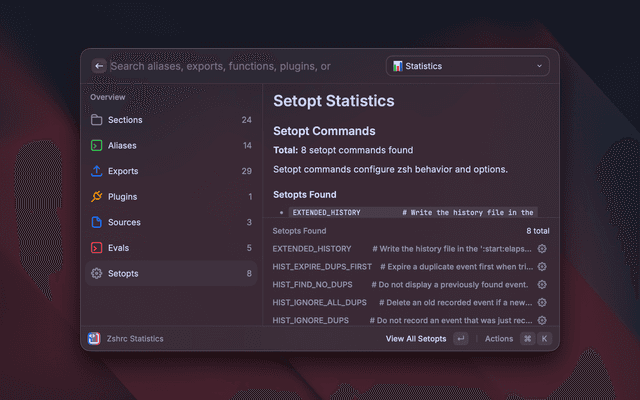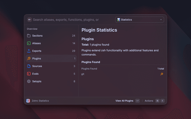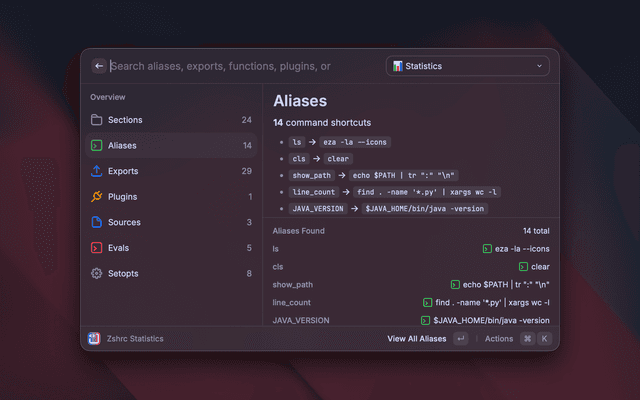 📊Statistics & OverviewComprehensive statistics of your zshrc configuration with counts of aliases, exports, functions, plugins, and more