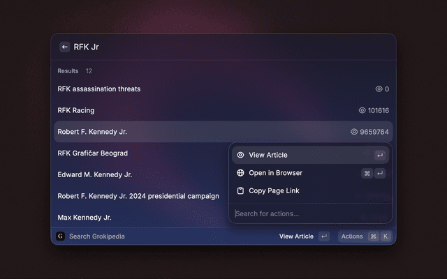 Tired of reading news written by people with a bias? Find articles of information about a given topic from Grokipedia, a bias-free encyclopedia powered by AI. It is available now on Raycast, with all functionality from the webpage, grokipedia.com!