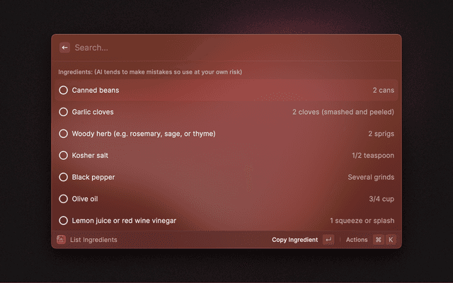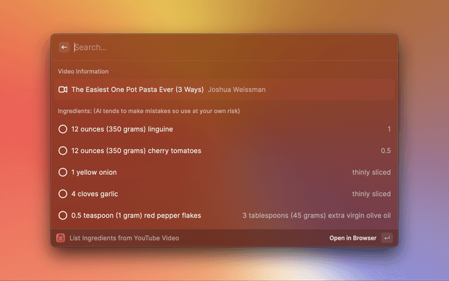 After using a youtube video's URL to get it's transcript or getting the contents of an entire website using selected text, you will receive a list of every single ingredient necessary in your recipe from online followed by it's quantities using Raycast's built-in AI.