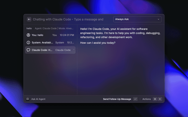 Connect to AI agents via Agent Client Protocol for coding assistance directly from Raycast.