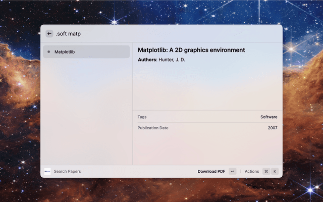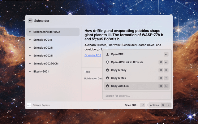 Extension for quickly accessing your bibmanager database from Raycast. Search the database (by bibkey, author, title, year or tags) and quickly access entries by opening or downloading the pdf. You can also open or copy the ADS link and copy the bibtex entry. Make sure to explore available actions in the action panel (⌘ + K).