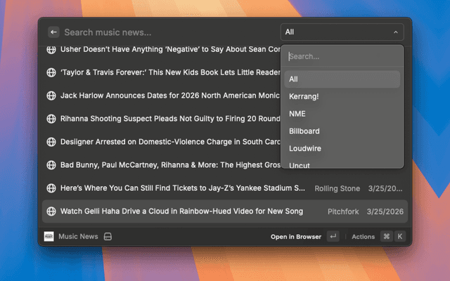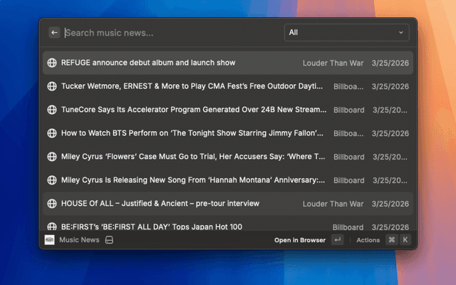 Read the latest music news from various sources directly in Raycast.