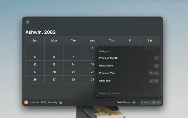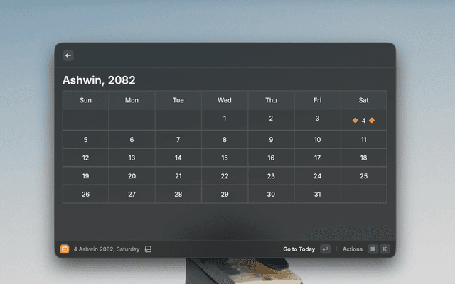 View the Nepali month calendar directly within Raycast. This extension allows you to quickly check dates, navigate through months and years, and view the calendar in either English or Nepali.