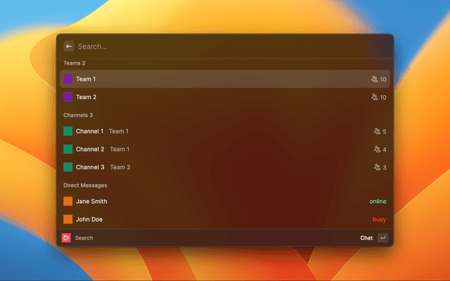 Search for teams, channels, users and set your presence status.