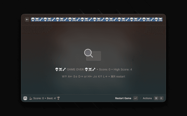 Launch the classic Snake game in your Raycast window. Use keyboard controls to navigate: