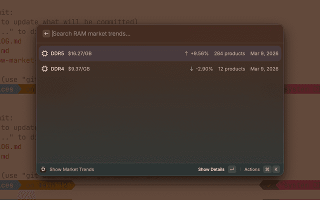 Show Market Trends shows DDR4 and DDR5 pricing in a searchable list.Market Trends Menu Bar shows the latest prices in the Raycast menu bar.Note: The Market Trends Menu Bar command is only available on macOS.