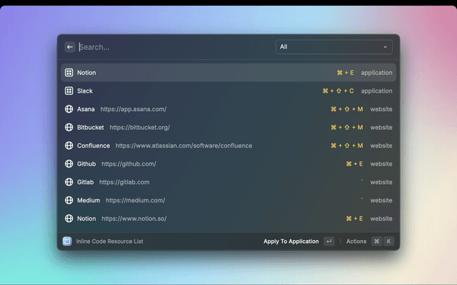 You should add a custom keyboard shortcut for Apply Inline Code before use it.