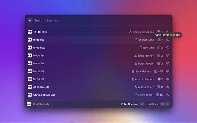 Quickly search for Are.na channels using the Search Are.na Channels command.