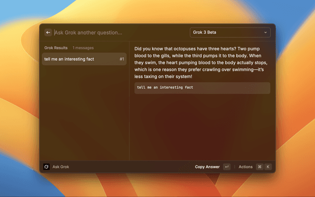 Props to the ChatGPT Raycast extension team for some of the functions and design choices / UX on here. Built with Grok.