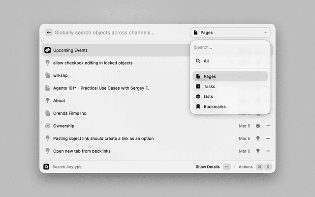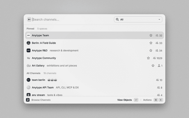 - Open: Use Command+Enter to instantly open the currently selected space or object in Anytype.