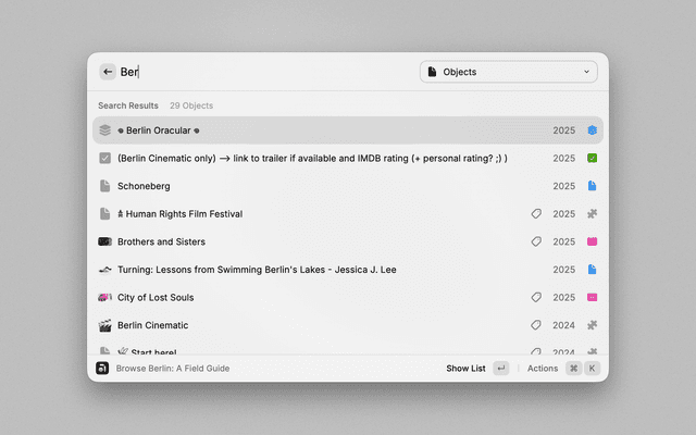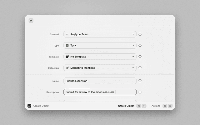 - Interact: Press Enter to view the object in Raycast or Command+Enter to open it in Anytype.