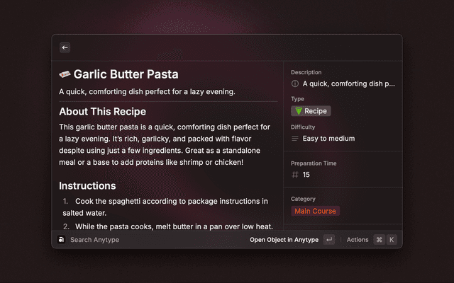 - Open: Use Command+Enter to instantly open the currently selected space or object in Anytype.